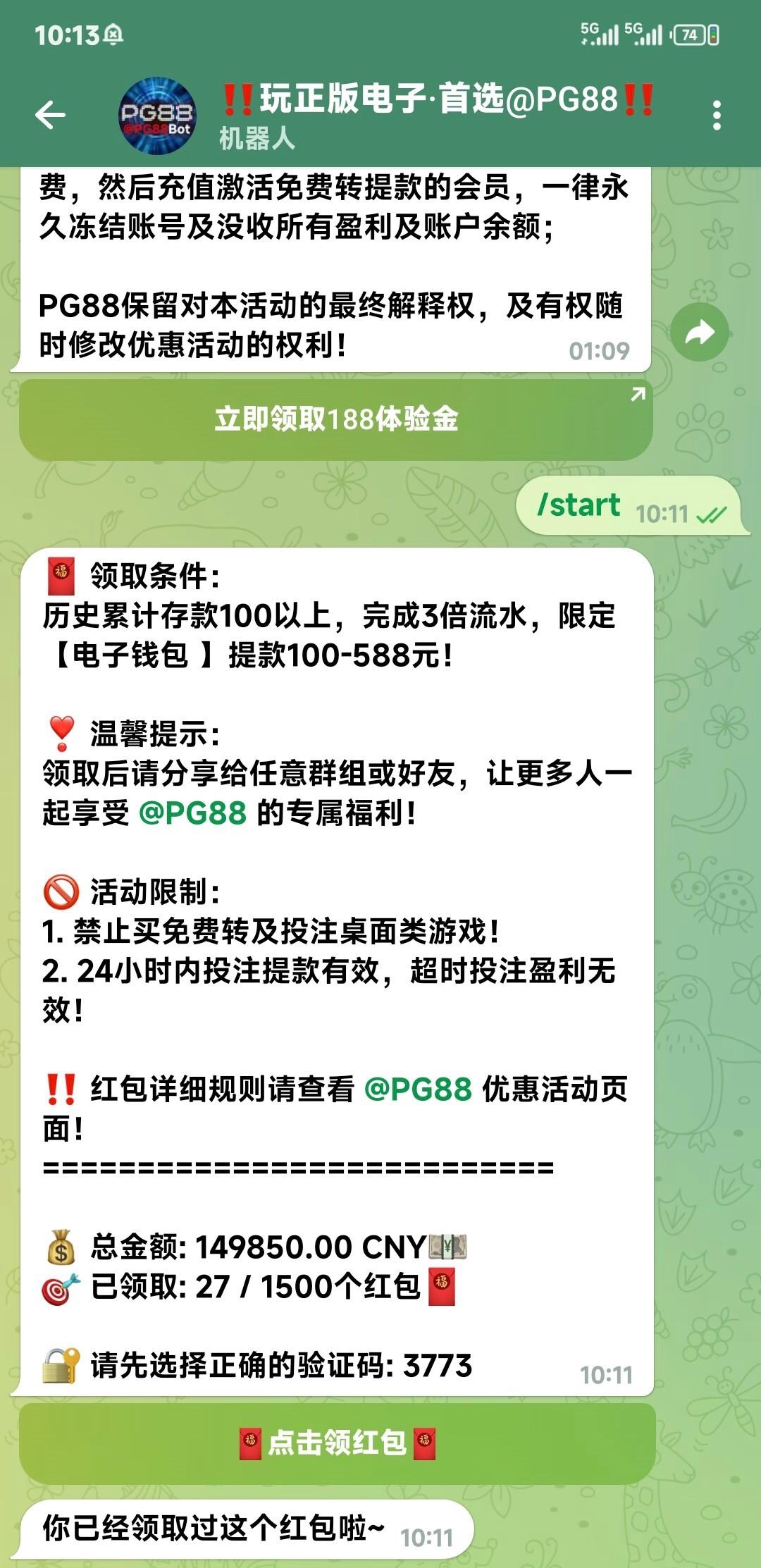 飞机关注@pg88机器人,历史充值100+就可以领取,人人99.99,1500个红包先到先得 有飞机的去