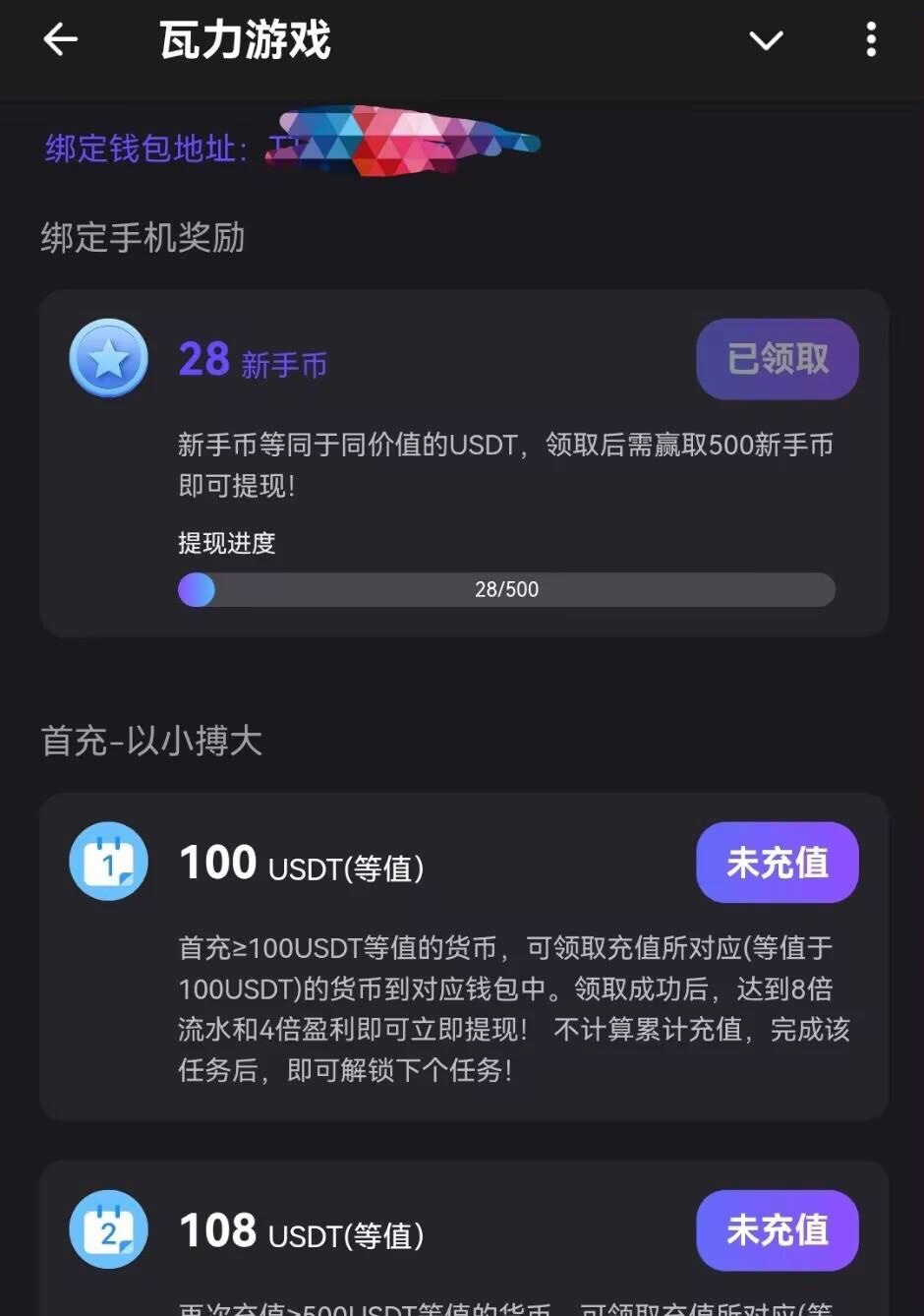 直接机器人进去,点新用户活动,绑定最近三个月活跃的地址和手机号自动领取,不限制游戏和流水,满500U提现(除了百家乐)