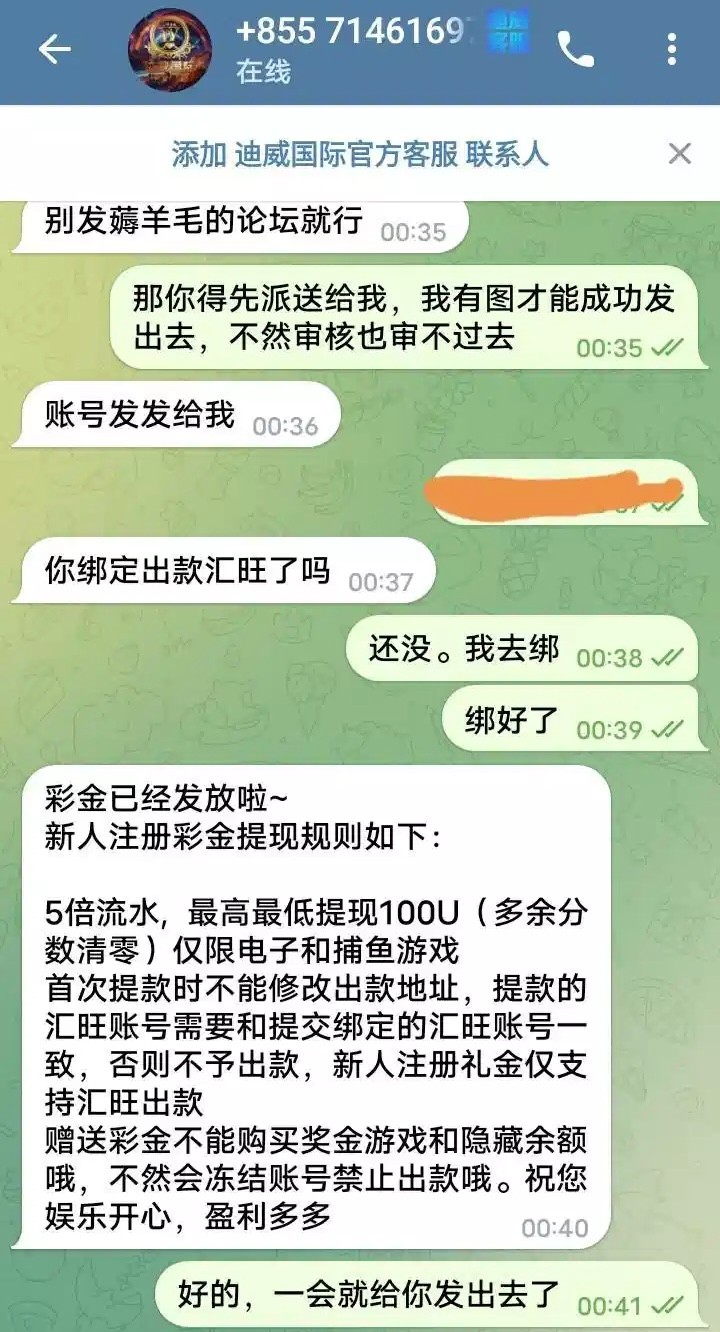 飞机客服@DVKF01,联系客服注册账号绑定汇旺,流水没啥要求,让我录频汇旺,我说忘了密码登不上,也送了,游戏界面什么图都不让截,每天固定100名额,没有等到12点去就可