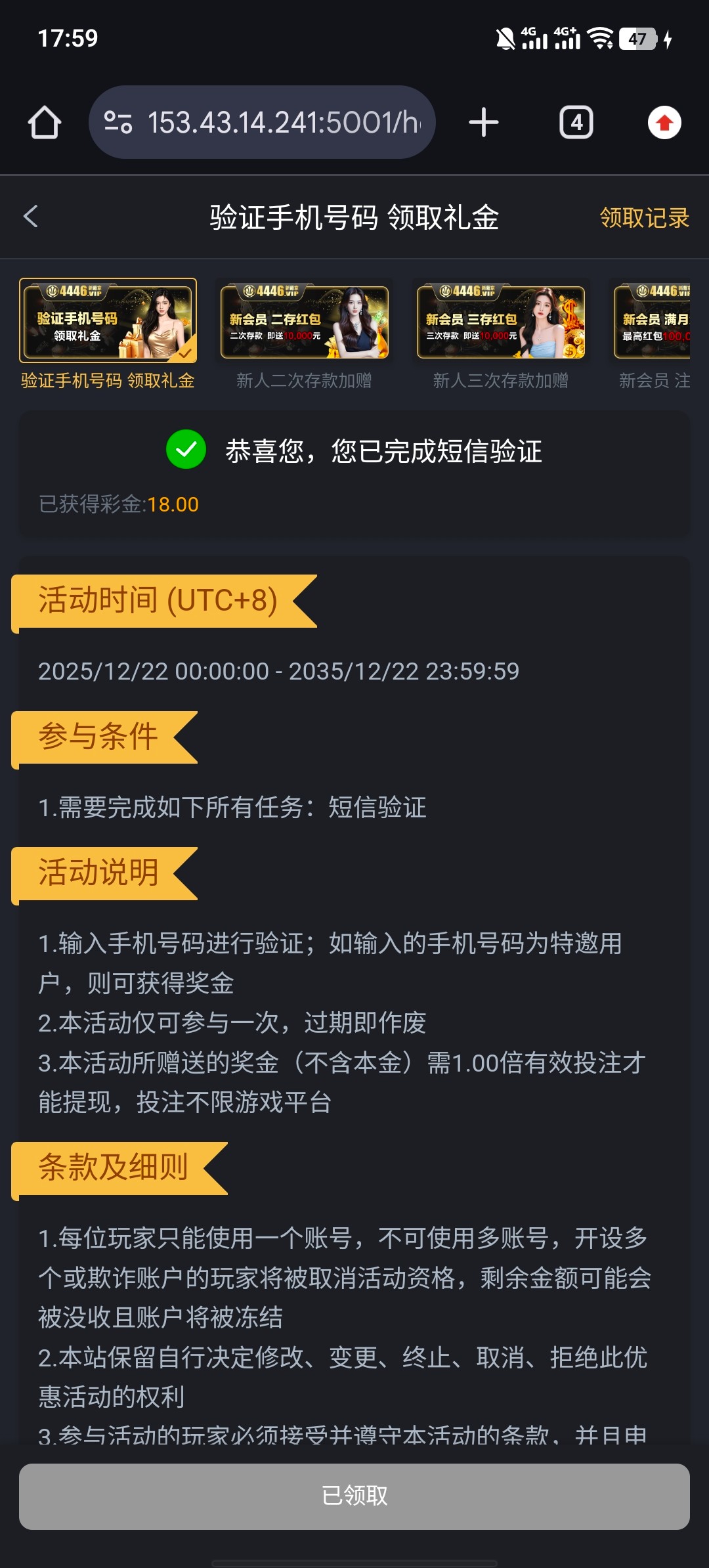 现在 大多数平台接码那些彩金 有两个不同的活动入口 一个是特邀的 用特邀手机号码直接注册就能显示活动入口 一个是平台的下载app活动入口 都是18彩金 想告诉一下大家 现在大多数平台 都是这样子了用指定特邀手机号码注册才显示那个活动入口 用账号注册的话没有那个活动入口 这是我昨天晚上注册的直接给我显示那个特邀活动 入口
