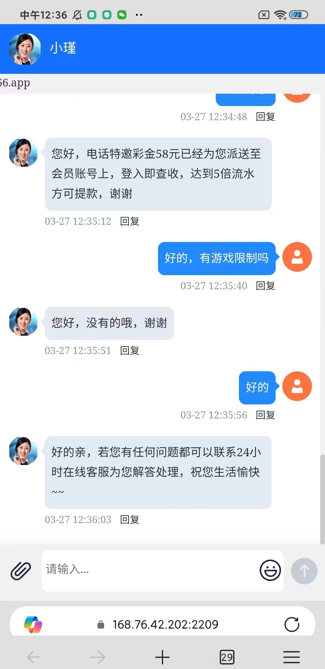 漏接电话的老哥,可以去碰碰,658元分七天送,我没有打出来,进去注册好,联系客服领取电话彩金,电话里头的链接,68992.vip,官网是46466.vip