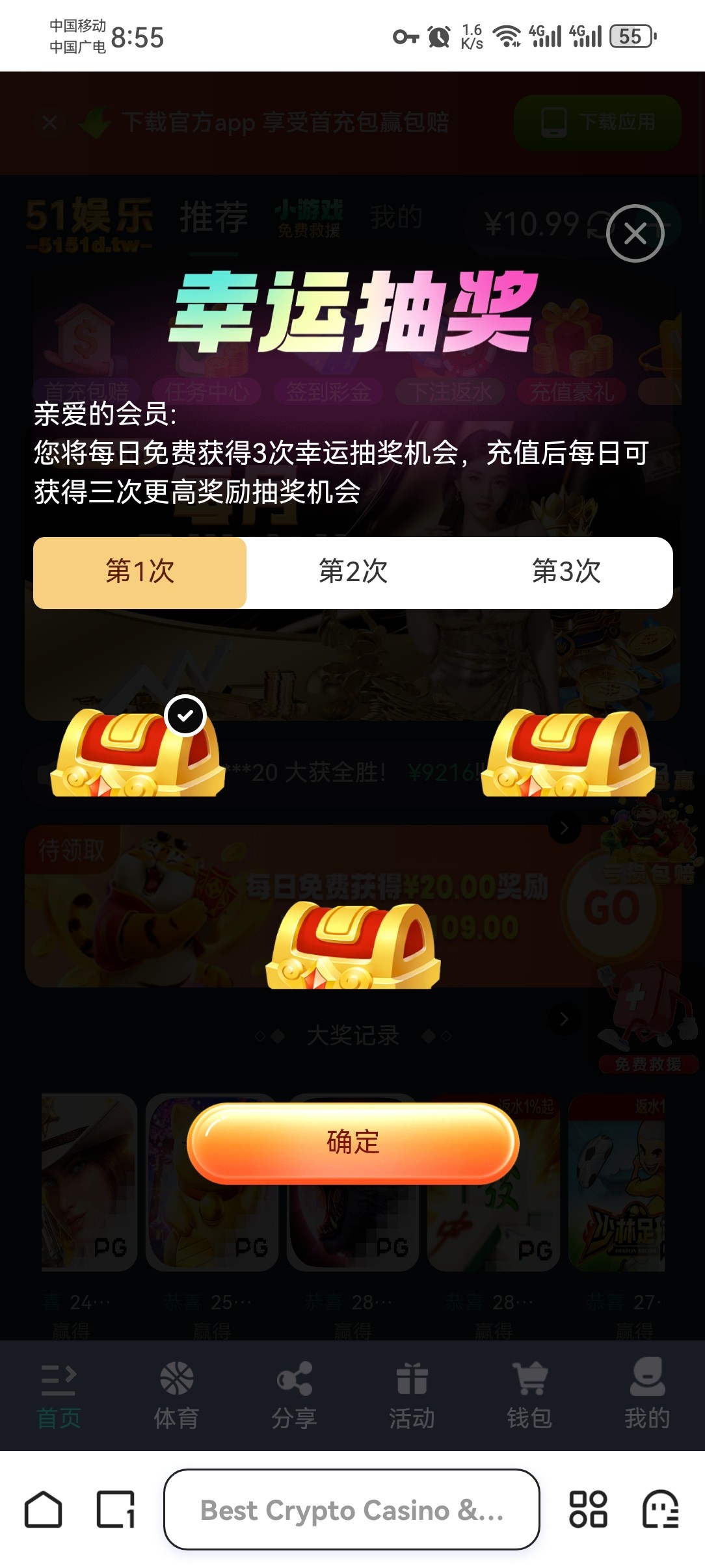 注册就送32,每天签到送2+,小游戏可以赚10几块,50才能进去pg,注册不用手机号,开vpn可以无限撸,我注册十几个,成功打下来一个